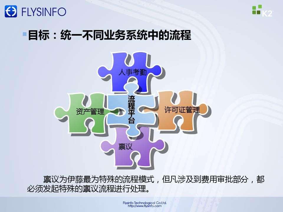 基于以上問題,2011年7月,伊藤啟動BPM平臺選型建設(shè)。通過嚴格的比選測試,最終選擇了K2作為BPM平臺,全面實現(xiàn)伊藤協(xié)同辦公及業(yè)務(wù)整合。成都飛逸提供系統(tǒng)實施服務(wù)。