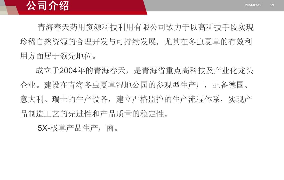 成立于2004年的青海春天,是青海省重點(diǎn)高科技及產(chǎn)業(yè)化龍頭企業(yè)。建設(shè)在青海冬蟲夏草濕地公園的參觀型生產(chǎn)廠,配備德國(guó)、意大利、瑞士的生產(chǎn)設(shè)備,建立嚴(yán)格監(jiān)控的生產(chǎn)流程體系,實(shí)現(xiàn)產(chǎn)品制造工藝的先進(jìn)性和產(chǎn)品質(zhì)量的穩(wěn)定性。