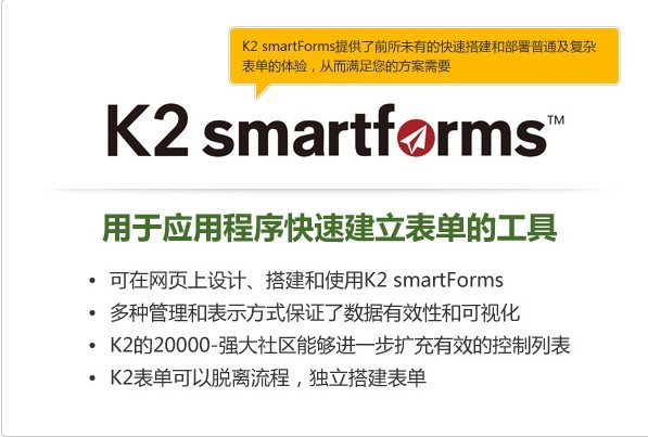 可在網(wǎng)頁(yè)上設(shè)計(jì)、搭建和使用K2 smartForms。由于支持最新HTML標(biāo)準(zhǔn),Microsoft Silverlight、IE、Firefox、Safari和Google瀏覽器,K2 smartForms提供了前所未有的快速搭建和部署普通及復(fù)雜表單的體驗(yàn),從而滿足您的方案需要。